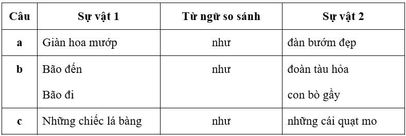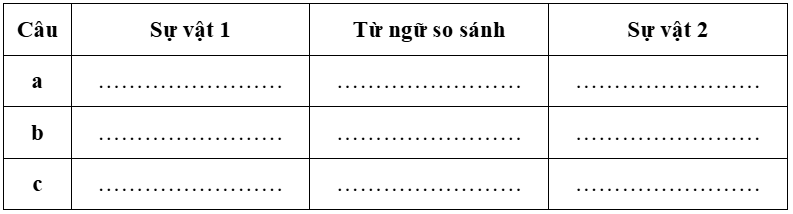 Câu 8. Đọc các câu văn và đoạn thơ dưới đây, tìm các sự vật được so sánh với nhau và hoàn thành bảng sau: