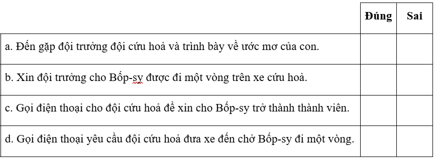 A. Cô nói về ước mơ của con mình và xin cho Bốp-sy được đi một vòng trên xe cứu hoả.