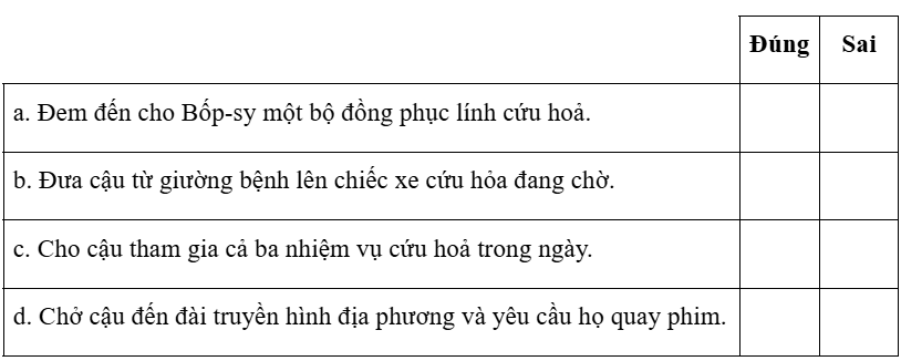 Câu 3. Những người lính cứu hoả đã làm gì để thực hiện lời hứa với bà mẹ? Đánh dấu ✓ vào các ô thích hợp: