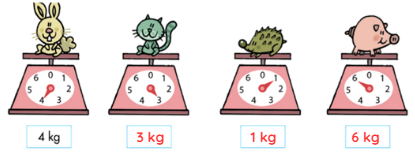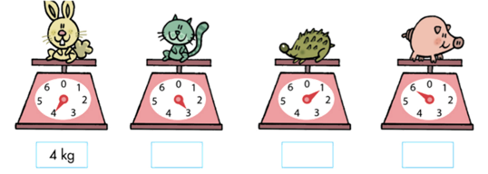 Câu 2. Ghi số cân nặng của mỗi con vật bên dưới chiếc cân.