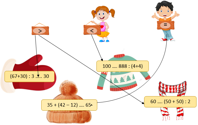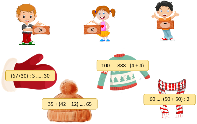Câu 3. Giúp các bạn lấy lại đúng đồ của mình bằng cách nối dấu >; <; = vào chố chấm phù hợp ở mỗi đồ vật. (0,5 điểm)