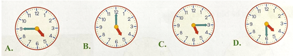 Câu 4. An về nhà ngay sau khi tan học. Thời gian đi từ trường về nhà là 15 phút. An về đến lúc 17 giờ. Đồng hồ nào dưới đây chỉ thời gian An tan học?
