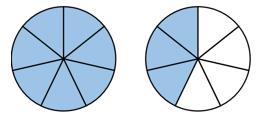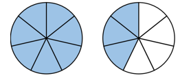 Hình thứ nhất chia thành 7 phần bằng nhau. Số phần đã tô màu là 7. Vậy hình thứ nhất đã tô màu \(\frac{7}{7}\) hình