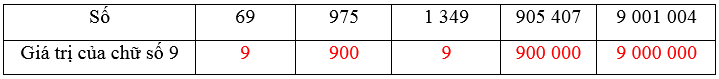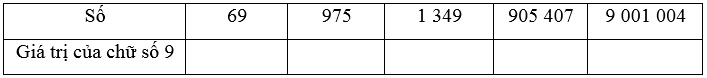 Câu 1: Viết giá trị của chữ số 9 trong mỗi số có trong bảng sau:
