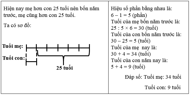 Câu 6: Hiện nay, mẹ hơn con 25 tuổi. Biết bốn năm trước tuổi mẹ gấp sáu lần tuổi con. Hỏi hiện nay, tuổi mẹ là bao nhiêu, tuổi con là bao nhiêu? (1.0 đ)