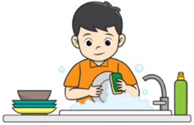 C. He does housework.