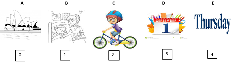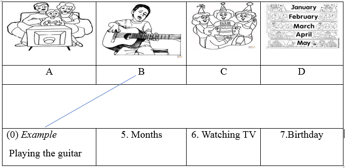PART 2. Questions 5 - 7. Match the words with pictures. There is an example (0) (0.75pts)