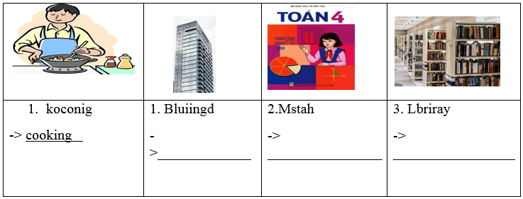 PART 1 Questions 1 - 3: Look at the pictures and the letters. Write the words. There is an example (0) (0.75pts)