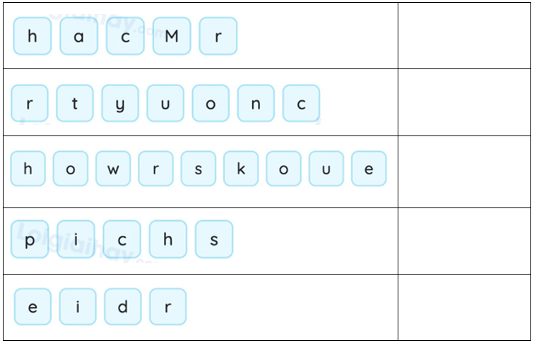 (Sắp xếp các chữ cái để tạo thành những từ đúng.)