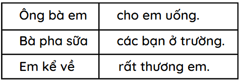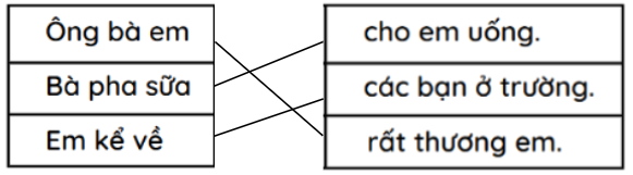 Ông bà em rất thương em. Sáng sáng, ông đưa em đến trường. Hết giờ, ông đón em về. Khi em về đến nhà, bà pha sữa cho em uống. Em kể cho ông bà nghe về các bạn ở trường.