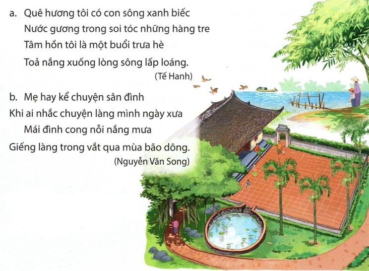 b. Các từ ngữ gợi cảnh vật quen thuộc: mẹ kể chuyện sân đình, mái đình cong, giếng làng trong vắt.