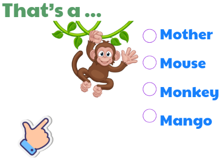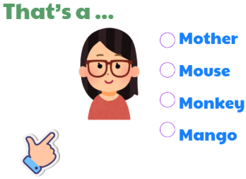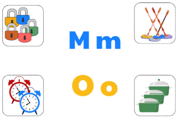 - Thực hành tạo câu: Cho trẻ thực hành bằng cách lần lượt đưa từng ảnh minh họa tương ứng với các chữ có âm của chữ M/ m, O/ o: “Mango” (quả xoài), “Mouse” (con chuột), “Mother” (mẹ), “Monkey” (con khỉ). “Clocks” (Những cái đồng hồ), “Locks” (Những cái ổ khóa), “Pots” (Những cái nồi), “Mops” (Những cây lau nhà).