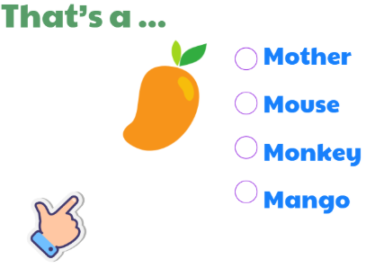 + Bố mẹ đưa hình ảnh hoặc đồ vật có chứa chữ M/ m như Mango( Quả xoài) , đẻ ở một nơi xa tầm tay và sau đó bố mẹ nói “ That’s a mango”.( Kia là một quả xoài.)
