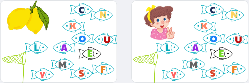 - Thực hành tạo câu: Cho trẻ thực hành bằng cách lần lượt đưa từng ảnh minh họa tương ứng với các chữ có âm của chữ L/ l: “Lake” (cái hồ), “Leaf” (cái lá), “Lemons” (Những quả chanh), “Lucy” (bạn Lucy).