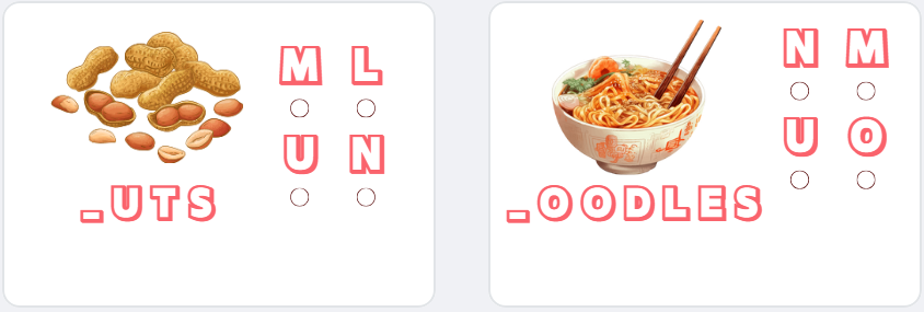 - Thực hành tạo câu: Cho trẻ thực hành bằng cách lần lượt đưa từng ảnh minh họa tương ứng với các chữ có âm của chữ N/ n: “Nick” (bạn Nick), “Nuts” (những hạt lạc, đậu), “Noodles” (Mì), “Bananas” (những quả chuối).