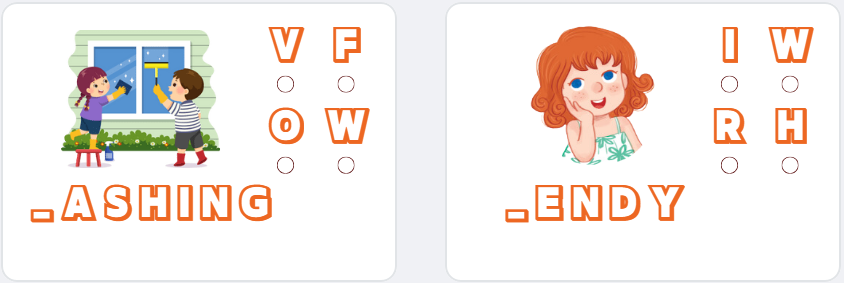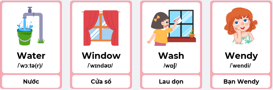 + Ôn lại từ vựng có chữ W/ w của bài tuần trước:”Window”, “Washing”, “Water”, “Wendy”.