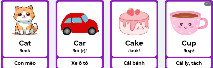 - Flashcard: Flashcard có từ vựng ở một mặt và hình ảnh minh họa ở mặt kia để con ghi nhớ từ hiệu quả hơn.