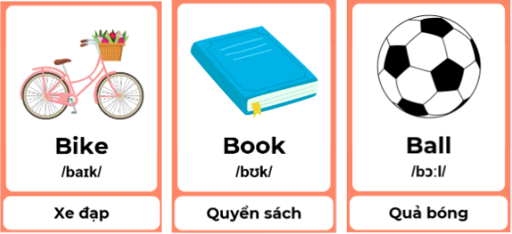 + Bước 1: Bố mẹ chuẩn bị danh sách các từ cần học và hình ảnh, ví dụ: book (quyển sách), bike(xe đạp), ball(quả bóng), cake (cái bánh), cup (cái ly), car (xe hơi), cat (con mèo), cake (cái bánh), cup (cái ly), car (xe hơi), cat (con mèo).