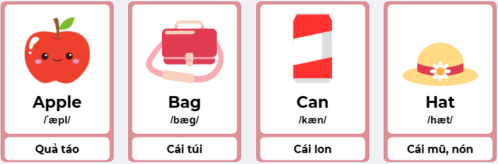 + Bước 1: Bố mẹ chuẩn bị danh sách các từ cần học và hình ảnh, ví dụ: apple(quả táo), bag(cái túi), can(cái lon), hat(cái mũ).
