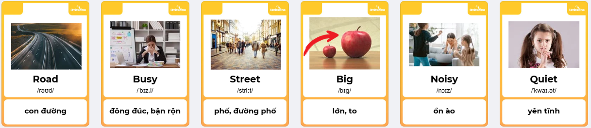 + Thẻ từ với các từ như: road, street, big, busy, quiet.