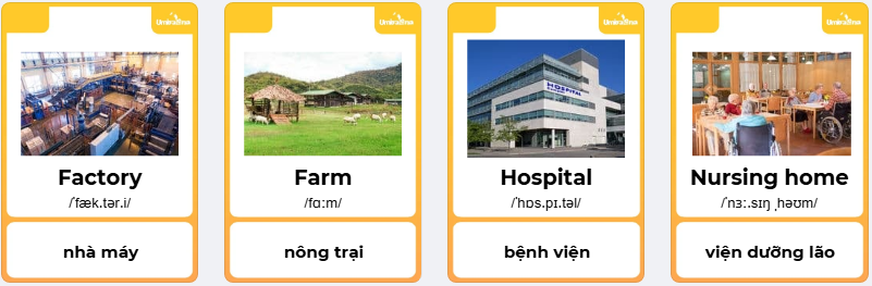 - Hình ảnh minh họa: Sử dụng thẻ từ và hình ảnh minh họa trực quan, sinh động, dễ hiểu cho từng từ vựng trong bài học: Hospital, farm, nursing home, factory.