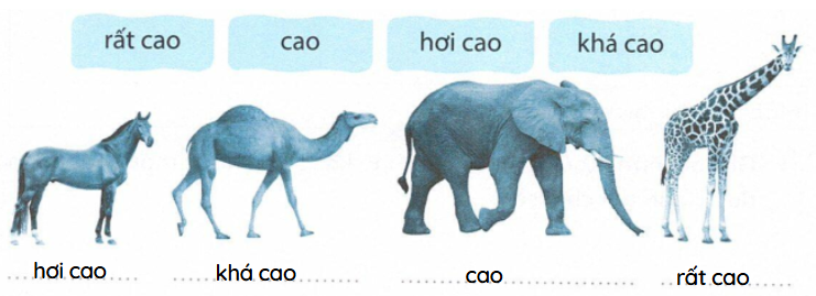 Chọn từ ngữ thích hợp để tả độ cao tăng dần của mỗi con vật trong hình.