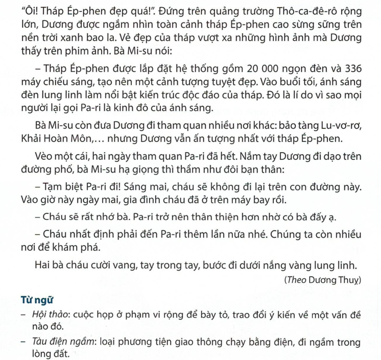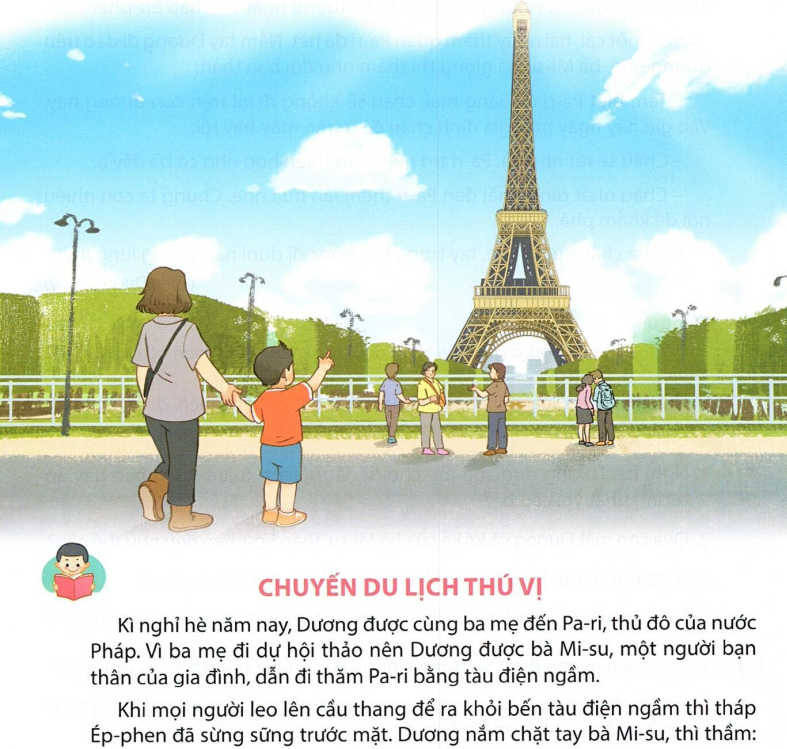 Nghỉ hè, Dương được ba mẹ cho đi du lịch ở Pa-ri, thủ đô nước Pháp. Dương ấn tượng nhất với tháp Ép-phen.