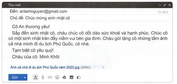 b. Trong thư, bạn nhỏ gửi ảnh cho cô bằng cách gửi tệp đính kèm.