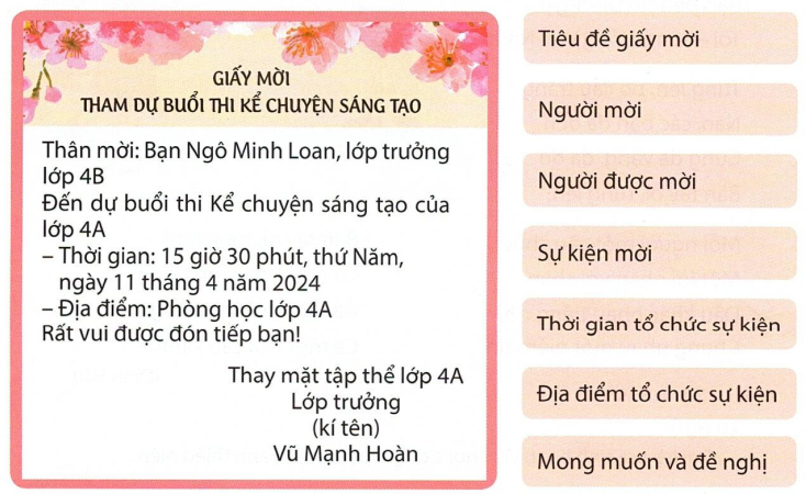 Đọc giấy mời sau và tìm thông tin ứng với các mục nêu ở bên.