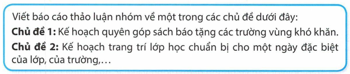 Hôm nay vào lúc 9 giờ ngày 05 tháng 09 năm 2023, tại phòng học lớp 4E, nhóm 1 đã tiến hành thảo luận chủ đề thảo luận nhóm về: "Kế hoạch quyên góp sách báo tặng các trường vùng khó khăn".