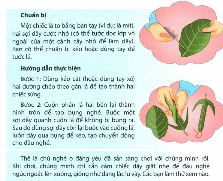 b. Phần chuẩn bị gồm: một chiếc lá to bằng bàn tay, hai sợi dây cước nhỏ, kéo hoặc dùng tay để tước lá.