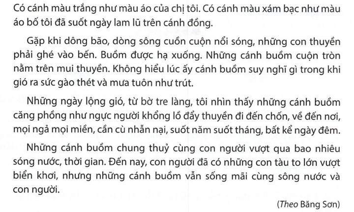 - Buổi nắng đẹp: những cánh buồn xuôi ngược giữa dòng sông phẳng lặng. Có cánh màu nâu như màu áo của mẹ. Có cánh màu trắng như màu áo của chị. Có cánh màu xám bạc như màu áo bố.