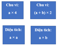 - Chuẩn bị: Các miếng hình vẽ có hình ngôi nhà vẽ hình chữ nhật, hình vuông, hình tứ giác, hình tam giác. Các miếng bìa có ghi các công thức sau: