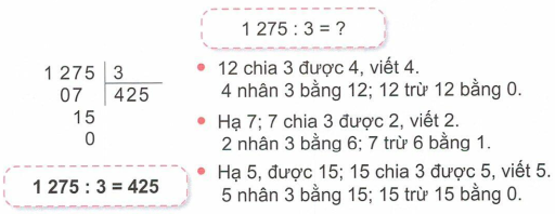 - Lặp lại các bước trên cho đến khi không còn chữ số nào của số bị chia để hạ xuống.