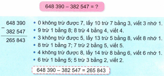 + Nếu chữ số bị trừ nhỏ hơn chữ số trừ, ta "mượn" 1 từ hàng liền kề bên trái (hàng lớn hơn), thêm 10 vào chữ số bị trừ rồi thực hiện phép trừ.