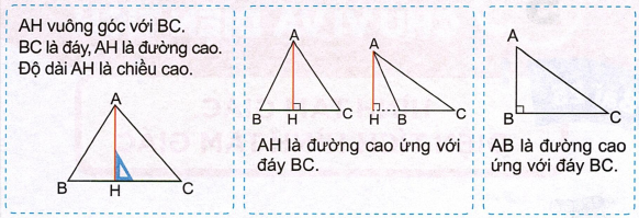 Chú ý: Trong hình tam giác, độ dài đoạn thẳng từ đỉnh vuông góc với đáy tương ứng gọi là chiều cao của hình tam giác.