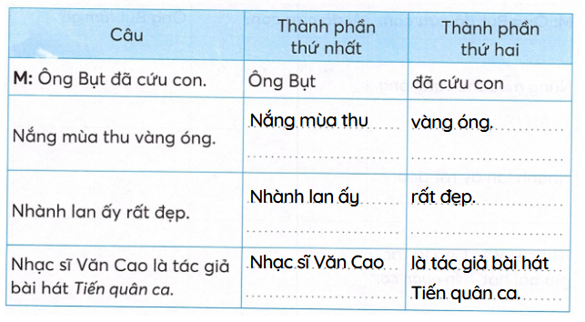Tách mỗi câu dưới đây thành hai thành phần.