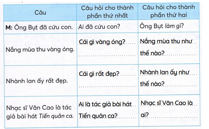 Từ kết quả bài tập 1, xếp thành phần thứ nhất và thành phần thứ hai của mỗi câu vào nhóm thích hợp. Đánh dấu √ vào ô trong bảng dưới đây.