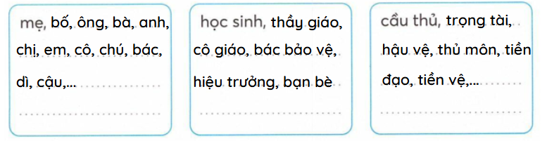 Viết tiếp các danh từ chỉ người cho mỗi nhóm.