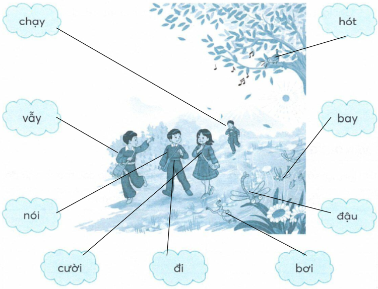 Quan sát tranh, nối từ chỉ hoạt động thích hợp với người và vật trong tranh.