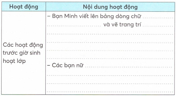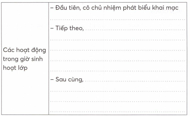 Ghi lại trình tự các hoạt động trong một buổi sinh hoạt lớp của lớp em.