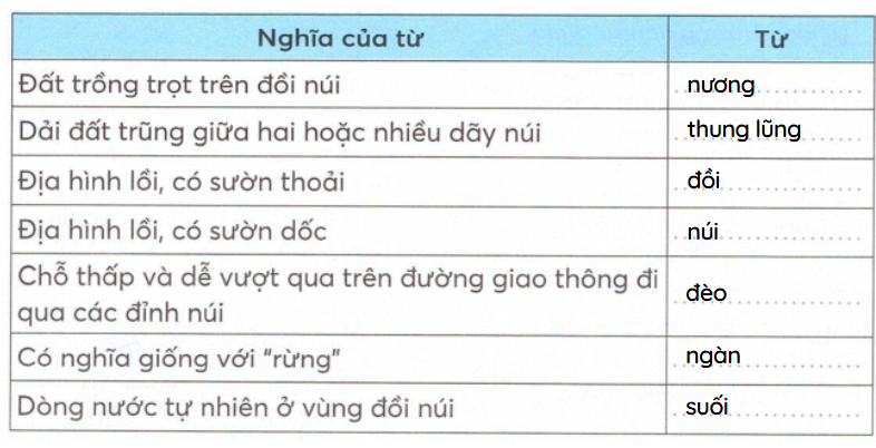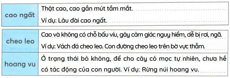 Tìm nghĩa của các từ cao ngất, cheo leo, hoang vu, rồi viết vào bảng.